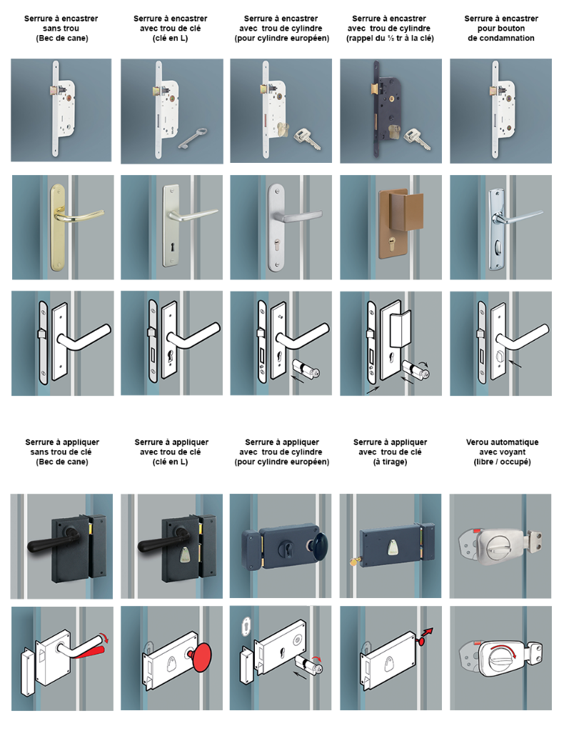 Il faut savoir que chaque serrure est accompagnée d’une poignée distincte selon son modèle. Voir le schéma ci-dessous.