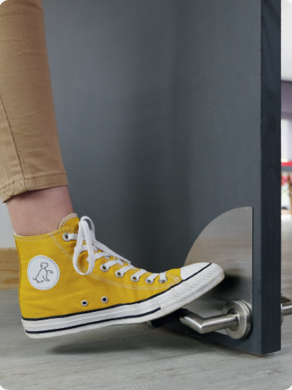 Kadoor est une révolution dans le domaine des poignées de porte, car celle-ci ne s'ouvre pas avec la main, mais avec le pied.