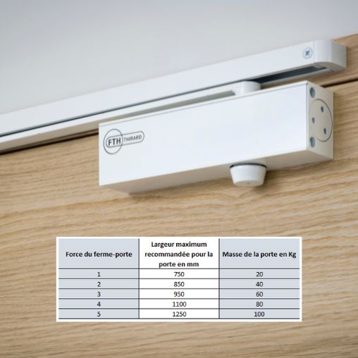 Ce ferme-porte est de force 5. Cependant, plus la porte est lourde, plus le ferme-porte doit posséder une force élevée. Exemple : pour une porte d’environ 60 kilos, il faudra une force 3. En cas de doute, il existe des modèles plus flexibles comme ceux de force 2 à 4 qui peuvent correspondre à des portes allant de 40 à 80kg. Adapter la force de son ferme-porte est primordial : si la force est trop élevée, vous aurez du mal à ouvrir votre porte ; en revanche si la force est trop faible, la fermeture automatique sera inefficace.